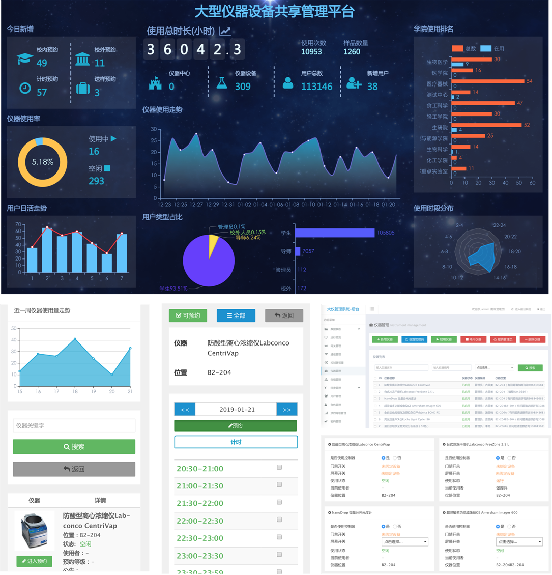“仪器共享管理平台”主要面向学生、老师、校外人员提供预约申请、上机、下机、查看交易流水等功能。分为两个子系统:(1)大型仪器设备在线预约平台,支持WAP、WEB、微信公众号、钉钉等多终端在线预约大型仪器设备,使大型仪器设备实验教学变得简单方便。(2)大型仪器设备综合管理平台,在线管理大型仪器设备,实时监测仪器设备使用状态,及获取分析相关数据。